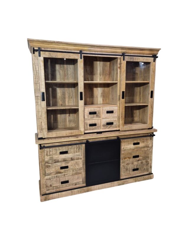 Industrial Mango Wood Buffet Cabinet with Triple Glass & Metal Sliding Doors