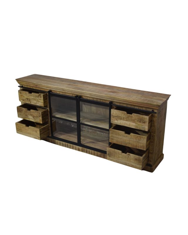 Mango Wood Sliding Glass Door Sideboard with Multi-Drawer Storage