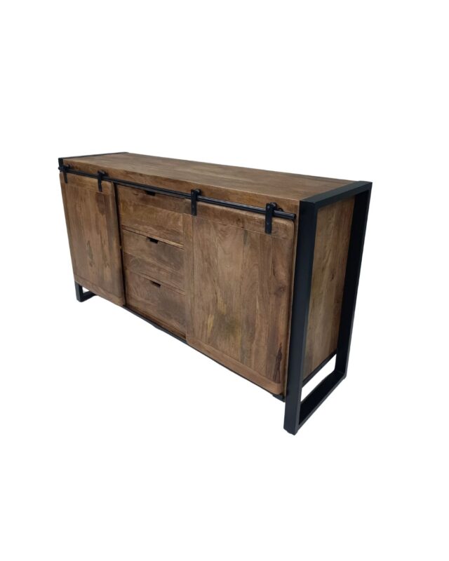 Industrial Solid Wood TV Cabinet with Dual Metal Sliding Doors & Storage Drawers