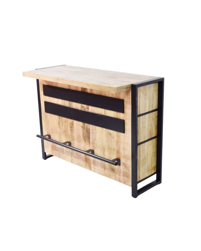 The front panel features sleek horizontal metal accents, while the sturdy footrest bar provides comfort and support—perfect for enjoying drinks, serving guests, or creating a stylish bar nook. Its spacious wooden top offers ample room for beverages, snacks, and bar accessories, making it a functional centerpiece for any setting. Whether used in a home bar, restaurant, office pantry, or showroom, this industrial bar counter enhances the ambiance with its contemporary craftsmanship and versatile utility.