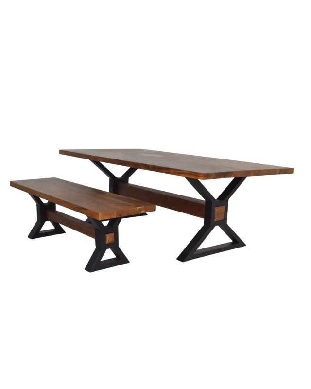 Solid Wood & Iron Dining Table Set with Matching Bench – Industrial X-Frame Design