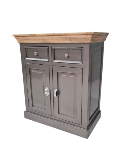Perfect for smaller spaces, this Grey Compact Sideboard Cabinet from VB Crafts combines classic elegance with everyday practicality. The cabinet features a warm natural solid wood top paired with a smooth grey-painted base, creating a modern yet timeless look that suits hallways, living rooms, bedrooms, or dining spaces. Two upper drawers keep cutlery, keys, or small accessories neatly organised, while the double-door cupboard below offers ample storage for dinnerware, linens, or everyday essentials. Paneled doors and polished metal knobs and cup handles add a refined finishing touch.
