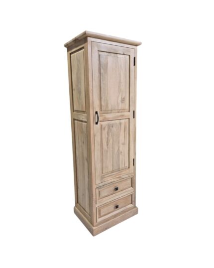 Bring timeless charm and practical storage to any room with this Classic Solid Wood Tall Cabinet from VB Crafts. Handcrafted in a warm natural finish, the slim design features a paneled single door that opens to spacious shelves for linens, clothes, crockery, or everyday essentials. At the bottom, two smooth-glide drawers provide extra space for smaller items, keeping everything neatly organised and within reach. Subtle moulding details, square feet, and sleek black hardware give this piece a refined, versatile look that suits classic, rustic, and modern interiors alike. Perfect for bedrooms, hallways, living rooms, or as an extra pantry in the kitchen.
