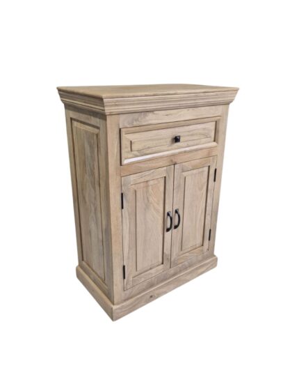 Add timeless elegance and handy storage to any room with this Classic Solid Wood 2-Door Cabinet from VB Crafts. Handcrafted in a soft natural finish, it features beautifully moulded edges, paneled sides, and a compact footprint that fits easily in hallways, bedrooms, living rooms, or dining spaces. A wide top drawer keeps everyday essentials like keys, cutlery, or linens organised, while the double-door cupboard below offers generous space for crockery, books, or household items. Black metal hardware adds a subtle modern contrast to the warm grain of the wood, making this cabinet both practical and stylish.