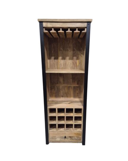 Create a stylish home bar in even the smallest corner with this Industrial Mango Wood Wine Cabinet from VB Crafts. Handcrafted from solid mango wood and framed with sleek black metal sides, this tall unit combines warm rustic charm with a modern industrial edge.