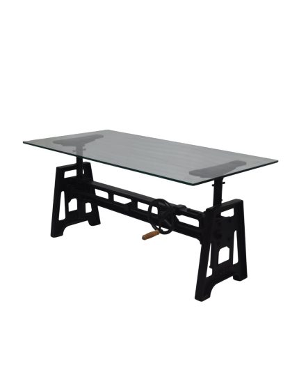The Vintage Glass-Top Crank Dining Table by VB Crafts is a striking blend of industrial engineering and sleek modern style. Featuring a sturdy cast-iron crank base and a clear rectangular glass top, this table lets you adjust the height effortlessly, making it ideal as a dining, work, or display table. The exposed gears and hand crank add authentic factory-inspired charm, while the glass top keeps the look light, open, and contemporary. Perfect for lofts, cafés, studios, and statement dining spaces.