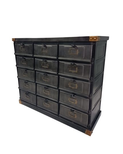 The Industrial 15-Drawer Metal Storage Cabinet from VB Crafts is a bold statement piece designed for serious storage. Crafted entirely from sturdy metal, this cabinet features fifteen spacious drawers with vintage-style label holders and pull handles. The matte black finish is accented with brass-toned corner brackets, giving it a rugged, workshop-inspired look that fits perfectly in lofts, studios, offices, or retail spaces. Ideal for organizing accessories, tools, documents, or craft supplies while adding strong industrial character to your interiors.