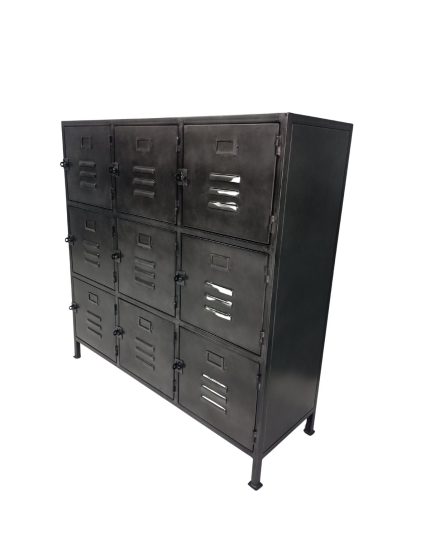 The Industrial 9-Door Metal Locker Cabinet by VB Crafts brings rugged factory charm and highly practical storage into your space. Crafted entirely from sturdy metal, this cabinet features nine locker-style doors arranged in a 3x3 grid, each with louvred vents, label slot, and latch for adding your own lock. The matte black finish and clean, minimal frame give it a bold industrial look that works beautifully in living rooms, offices, studios, cafes, gyms, or entryways. Use it to store shoes, files, accessories, tools or daily essentials while adding strong character to your décor.