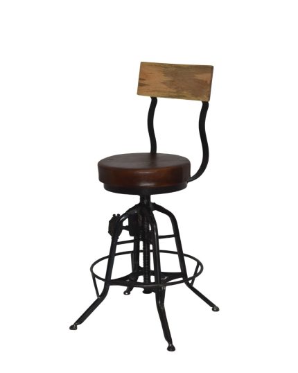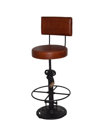 Add a bold industrial statement to your space with this Vintage Adjustable Bar Stool featuring a solid wooden backrest and cushioned leather seat. Built with a sturdy iron base and classic crank mechanism, this stool blends rustic charm with modern functionality. Perfect for kitchens, bars, cafés, and industrial-style interiors, it offers both comfort and character. The handcrafted details and raw metal finish give it an authentic vintage appeal.