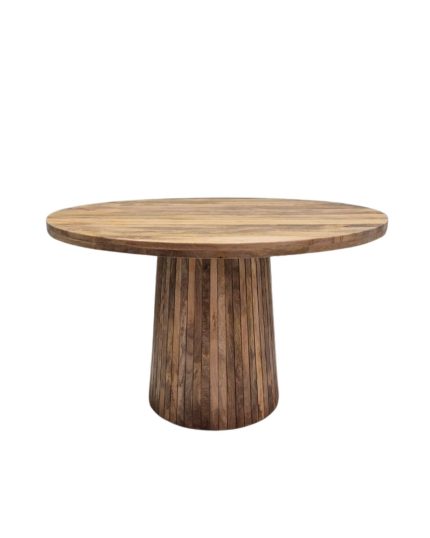 Elevate your dining and living spaces with the stunning Premium Round Wooden Pedestal Dining Table. Handcrafted from high-quality solid wood, this table features a beautifully smooth round top supported by a vertically slatted cylindrical pedestal base. The unique slatted design adds a rich texture, giving the table a bold yet elegant presence. Perfect for dining rooms, cafés, boutique interiors, and modern homes seeking a blend of craftsmanship and natural beauty.