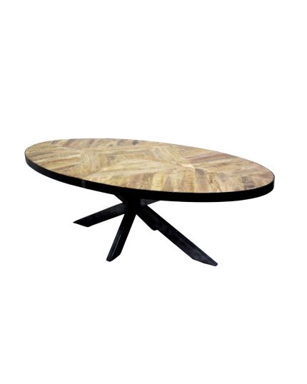 Make a bold statement in your dining space with this elegant Oval Mango Wood Dining Table, crafted with a stunning patterned top and a sleek star-shaped metal base. The tabletop features a beautiful herringbone-inspired design made from high-quality mango wood, offering rich texture and natural warmth. The modern star-leg base, constructed from heavy-duty metal, ensures excellent stability while adding a contemporary industrial touch. Ideal for modern homes, cafés, and interior-designed spaces, this table blends artistry, durability, and premium craftsmanship.