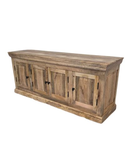 Bring timeless elegance and natural warmth to your living room with the VB Crafts Classic Solid Wood TV Cabinet. Expertly handcrafted from high-quality solid wood, this TV unit features a beautifully carved frame, traditional panel-style doors, and a rich rustic finish that enhances the natural grain of the wood. Designed for maximum utility, the cabinet includes four spacious swing-door compartments, offering generous concealed storage for electronics, accessories, books, and household essentials. Its sturdy base and long top surface ensure excellent stability and support for large TVs, décor items, or entertainment setups. Perfect for classic, rustic, farmhouse, and vintage interiors, this TV cabinet adds charm, durability, and functional storage to any home.