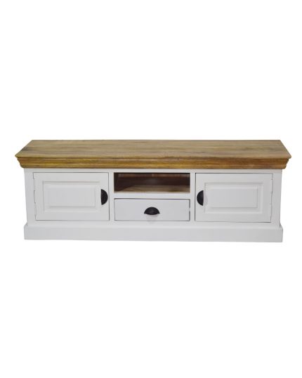 Bring timeless elegance to your living room with the VB Crafts Classic White Solid Wood TV Cabinet. Beautifully handcrafted, this TV unit features a striking combination of a natural wooden top and a smooth white painted base—perfect for modern, vintage, and farmhouse-inspired interiors. Designed for maximum functionality, the cabinet includes two spacious side door compartments for concealed storage, a central open shelf ideal for set-top boxes or gaming consoles, and a convenient pull-out drawer for remotes, accessories, and everyday essentials. The solid wood construction ensures durability, while the clean design blends seamlessly with any home décor.