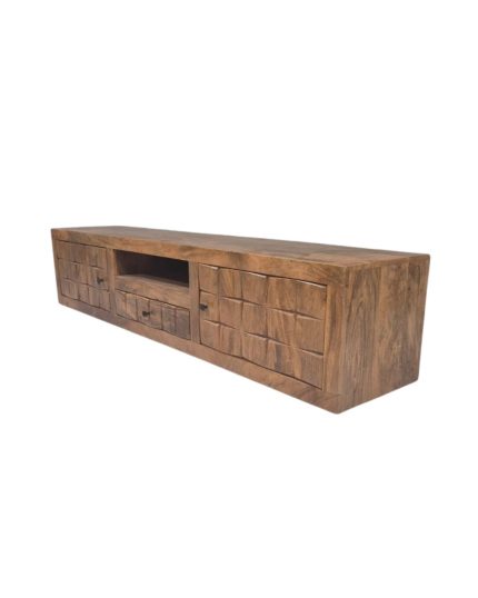 Enhance your living room with the artistic beauty of the VB Crafts Solid Wood Carved Panel TV Cabinet. Handcrafted from premium solid wood, this cabinet features intricately carved geometric panels that add texture, depth, and designer appeal. The wide surface top is ideal for large TVs, décor pieces, and home entertainment setups. The central open shelf provides space for media devices, set-top boxes, or speakers, while the lower drawers and side cabinets offer ample concealed storage. Designed for both style and functionality, this TV cabinet delivers warmth, craftsmanship, and long-lasting durability, making it the perfect statement piece for modern, rustic, or traditional interiors.