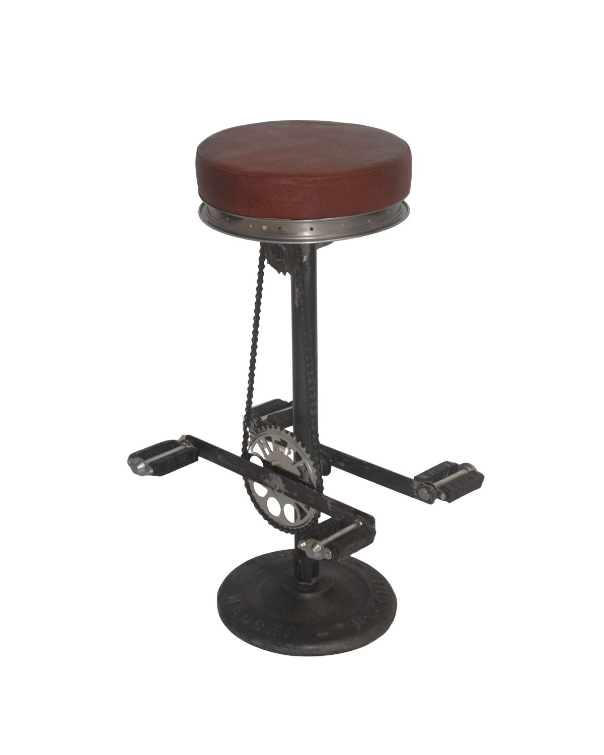 Introduce a bold industrial vibe to your space with this Vintage Bicycle Pedal Bar Stool by VB Crafts. Designed with authentic pedal-and-chain detailing, this stool brings a creative, retro twist to traditional seating. The rich brown cushioned seat offers comfort, while the heavy cast-iron base ensures strong stability. The rotating pedals add a playful, interactive touch, making this stool an eye-catching focal piece for cafés, bars, lounges, game rooms, and industrial-themed interiors.