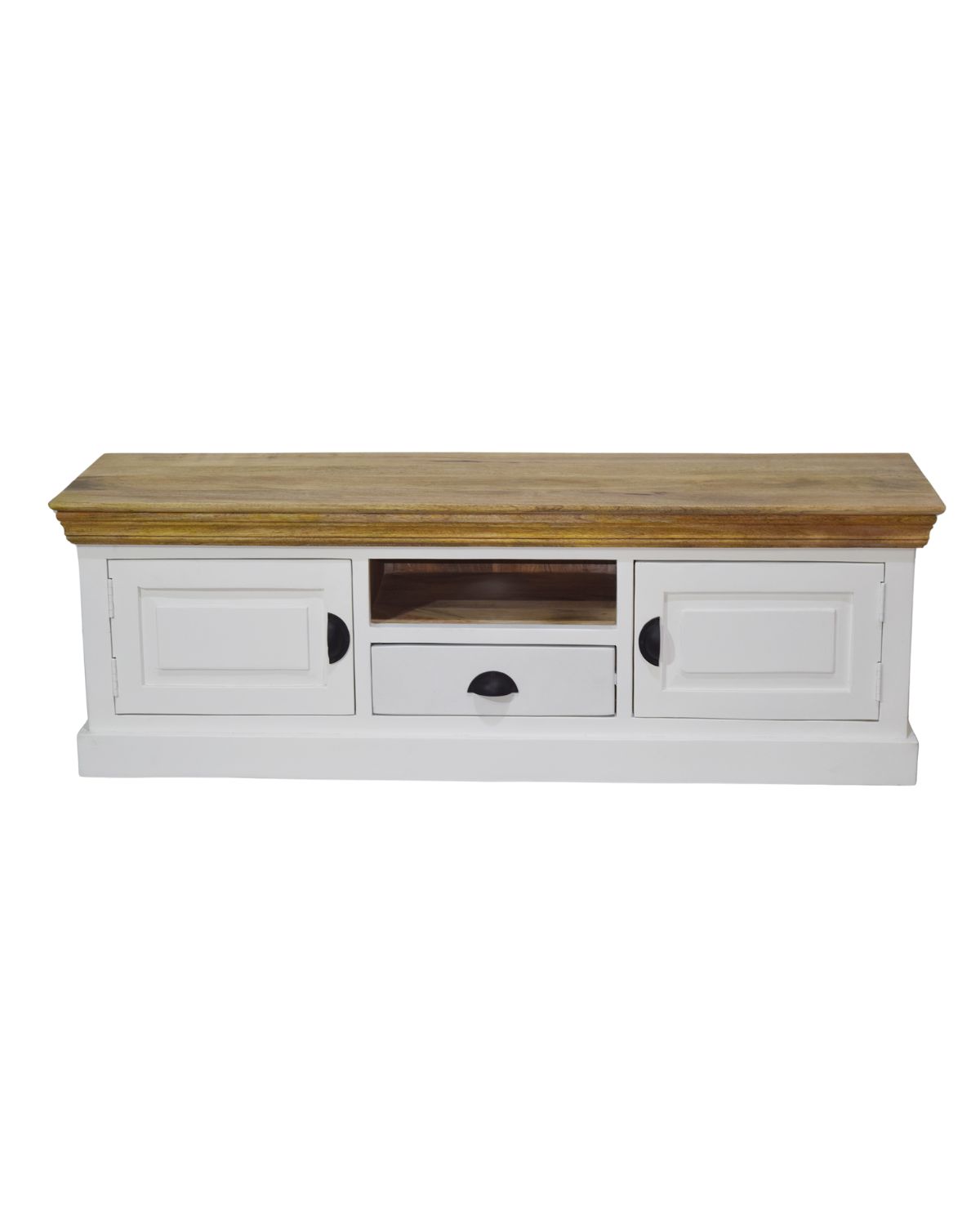 A timeless white solid wood TV cabinet with a warm natural top, ample storage, and elegant craftsmanship—exclusively from VB Crafts.