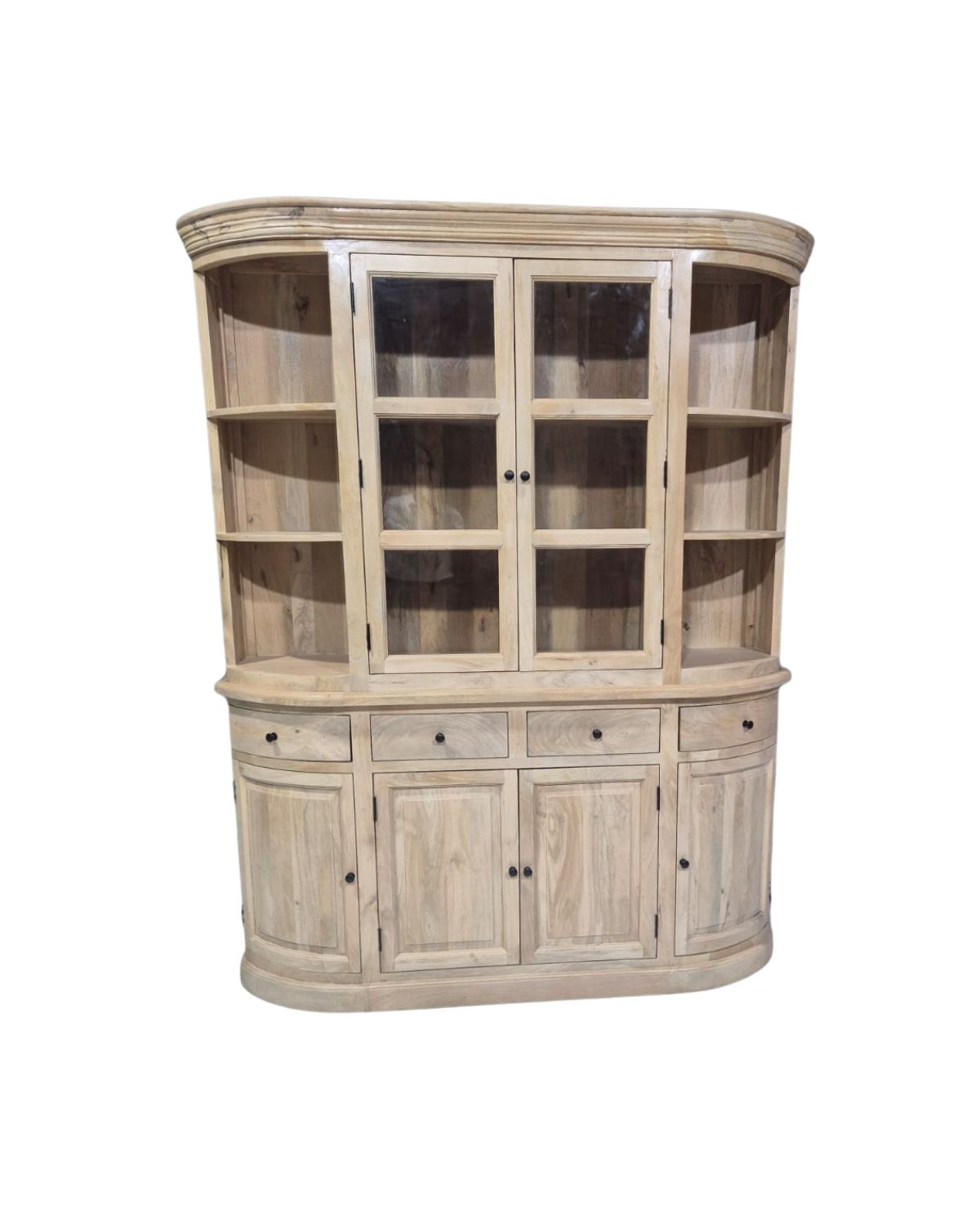 The upper hutch features two framed glass doors in the centre for showcasing crockery, glassware, or décor, flanked by open curved side shelves that are perfect for styling favourite pieces and accents. The lower buffet includes a full row of four drawers for cutlery and linens, with four paneled cabinet doors beneath offering generous concealed storage for serving dishes and everyday essentials.