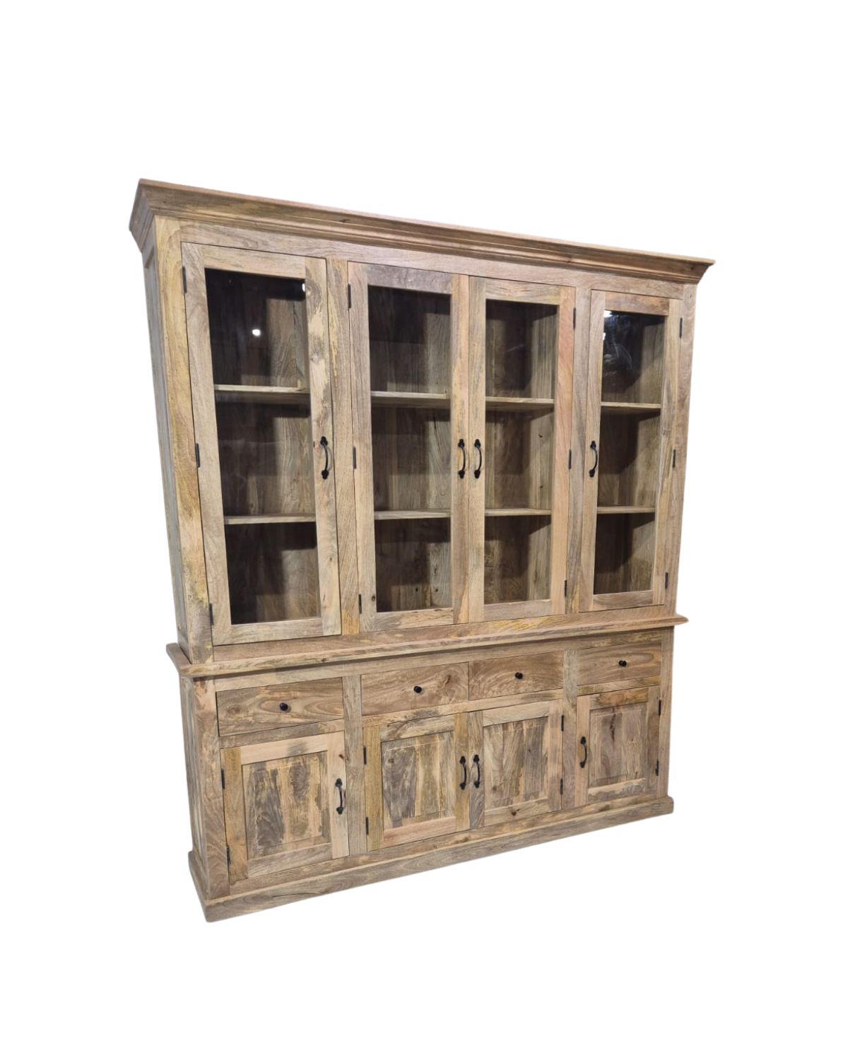 Handcrafted from solid mango wood, this large cabinet is designed for homes that need both generous display space and organised storage.
