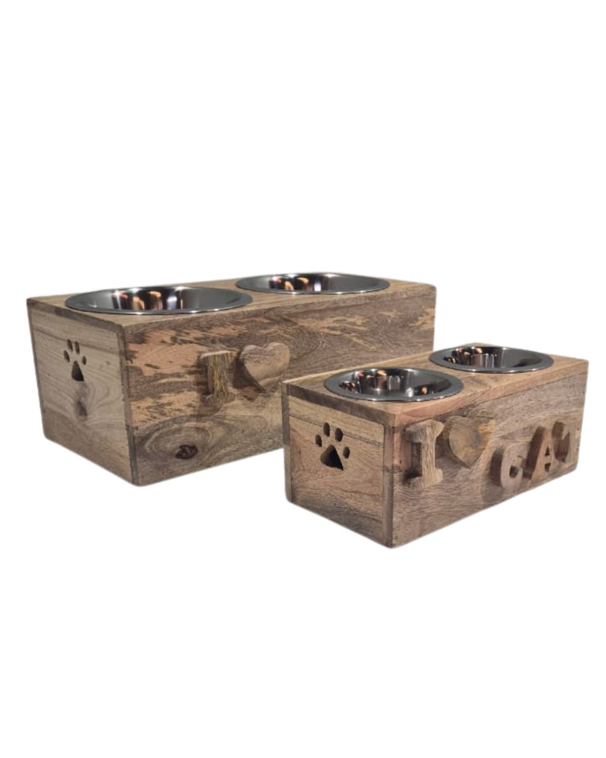 Handcrafted solid wood pet feeder with “I ❤️ Pet” carved design and stainless steel bowls. Stylish, durable, and available in two sizes—perfect for making your pet’s mealtime special. Exclusively from VB Crafts.