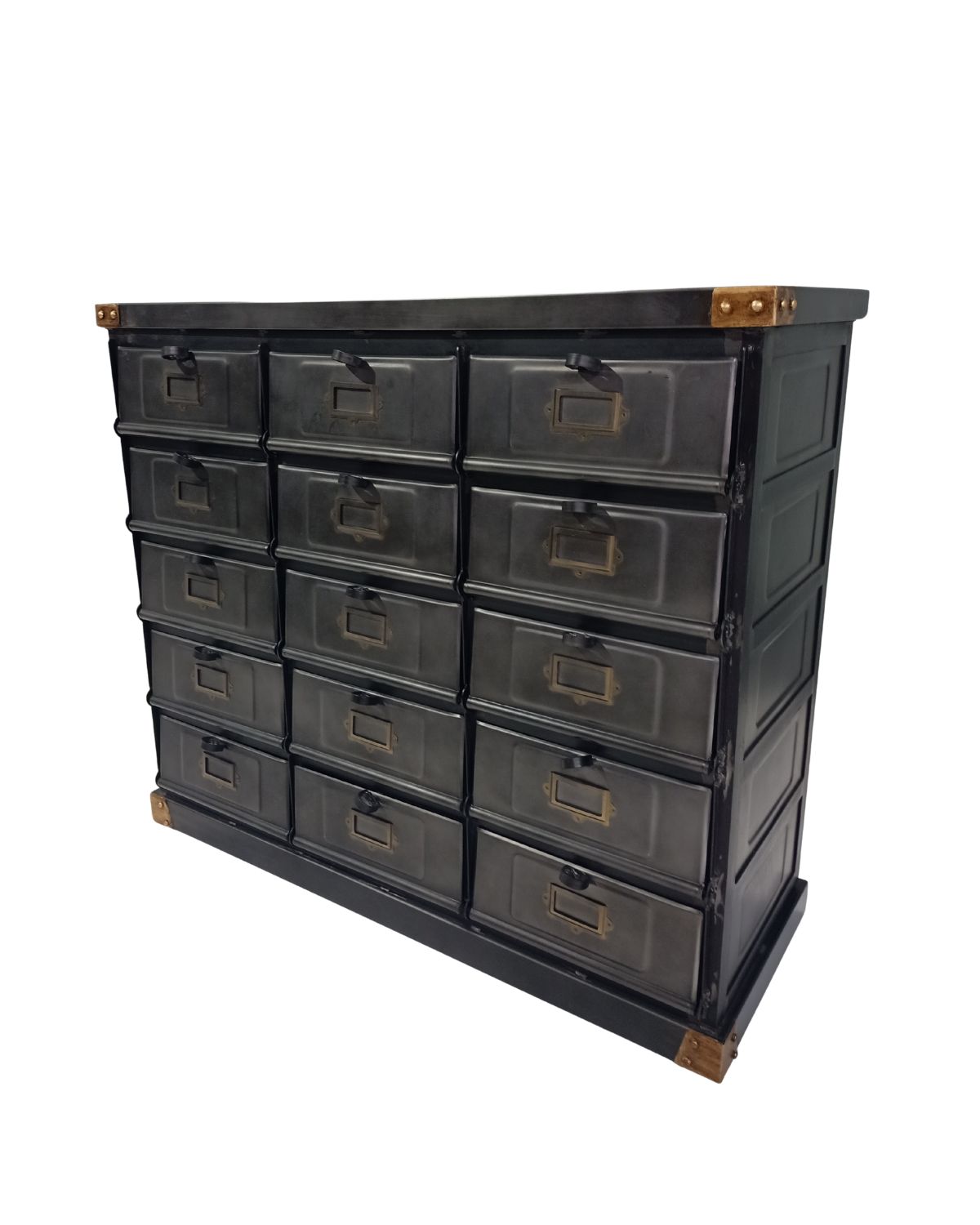 Industrial 15-drawer metal storage cabinet with label pulls and brass corner accents – perfect for organized, stylish storage in any industrial or contemporary space.