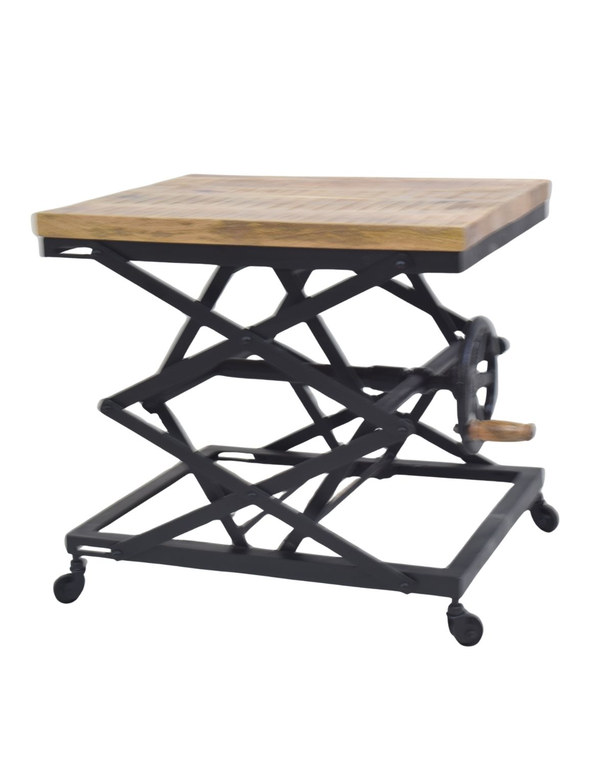 A height-adjustable industrial crank table with a solid wood top and strong iron frame—functional, stylish, and perfect for modern interiors.