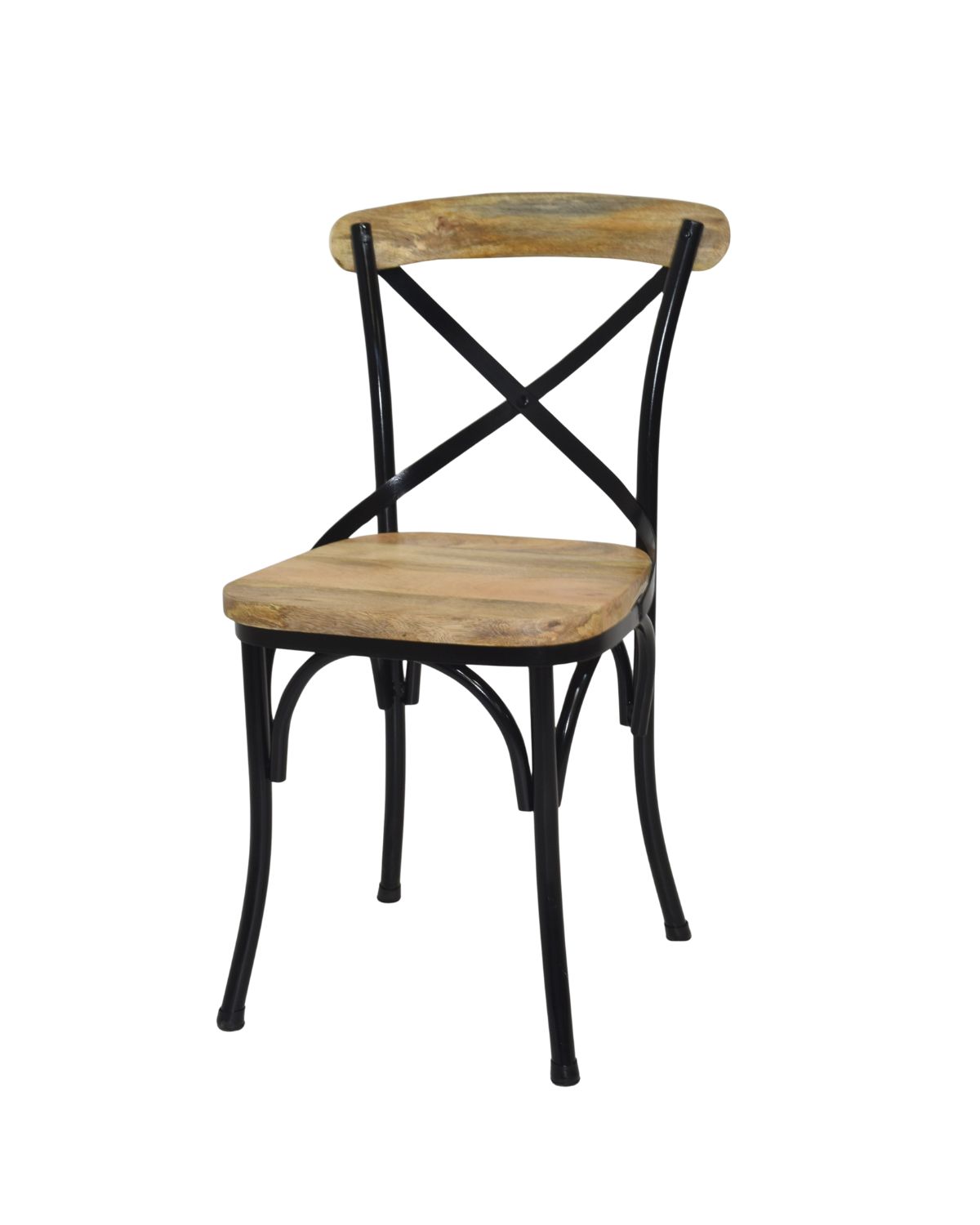 Industrial Cross Back Dining Chair with solid wood seat and back, sturdy black metal frame, and classic cross-back design – a perfect blend of rustic warmth and modern industrial style for dining spaces and cafés.