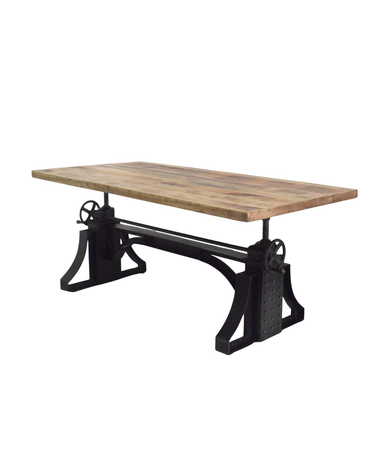 Height-adjustable industrial crank dining table with solid mango wood top and heavy cast iron base—perfect as a bold, functional centerpiece for home or commercial interiors.