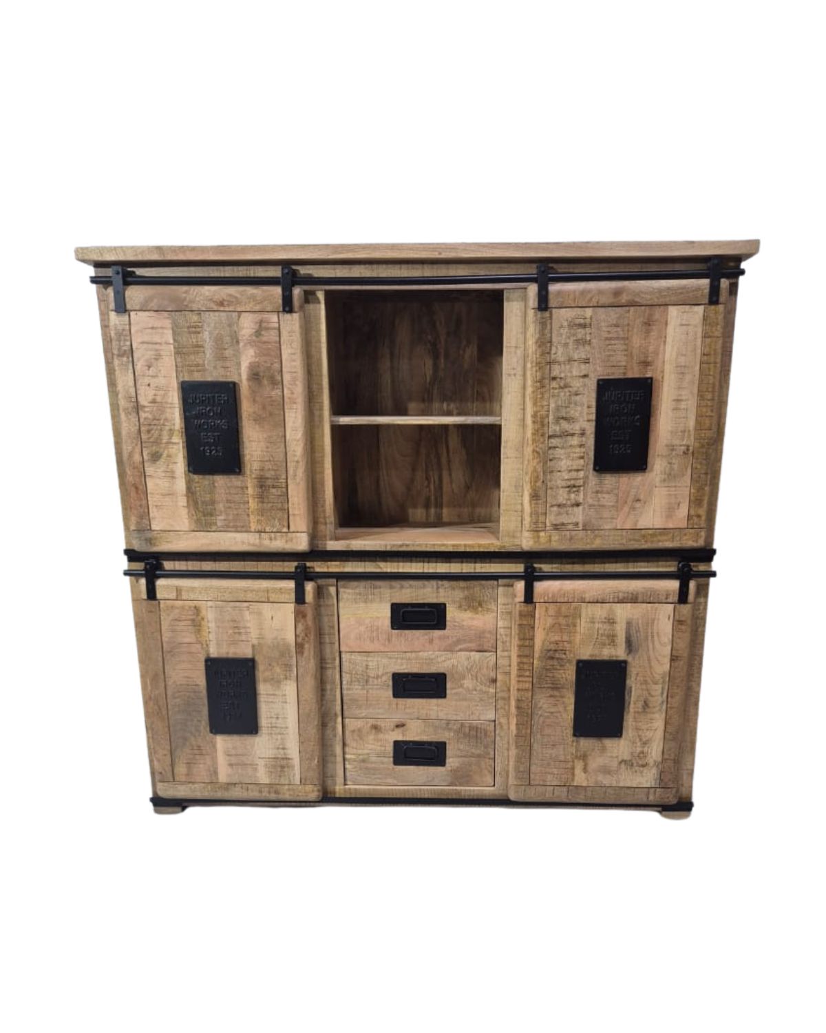 Bring rugged industrial charm into your home with this Mango Wood Buffet Cabinet from VB Crafts.
