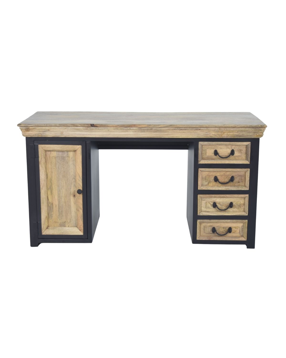 A stylish industrial mango wood desk with a spacious top, storage cabinet, and four drawers—perfect for creating an organized and elegant workspace at home or office.