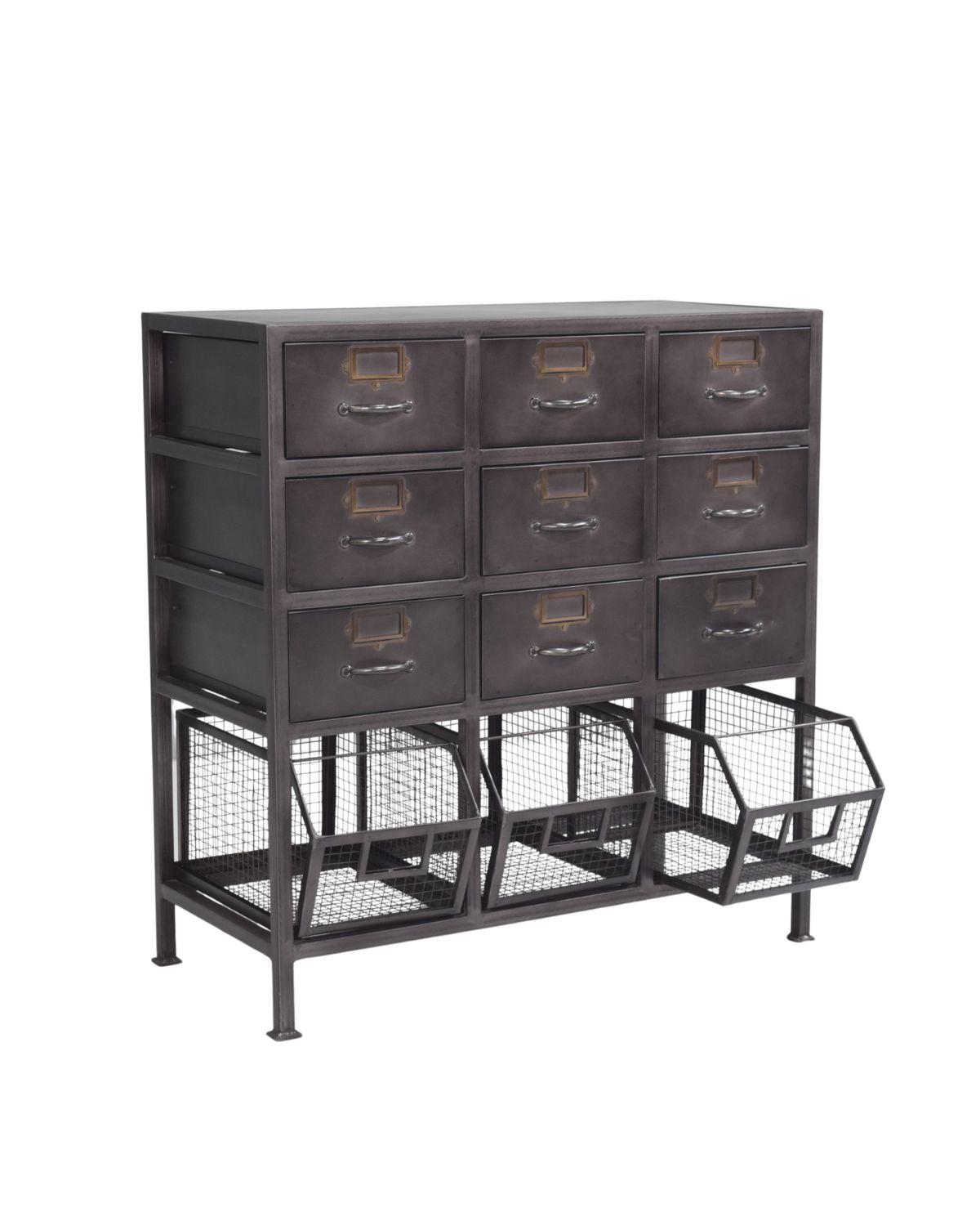 Organise in true warehouse style with this Industrial Metal Multi-Drawer Cabinet with Wire Baskets from VB Crafts. Crafted entirely from sturdy metal with a distressed, gunmetal finish, this piece is inspired by vintage workshop and apothecary storage.