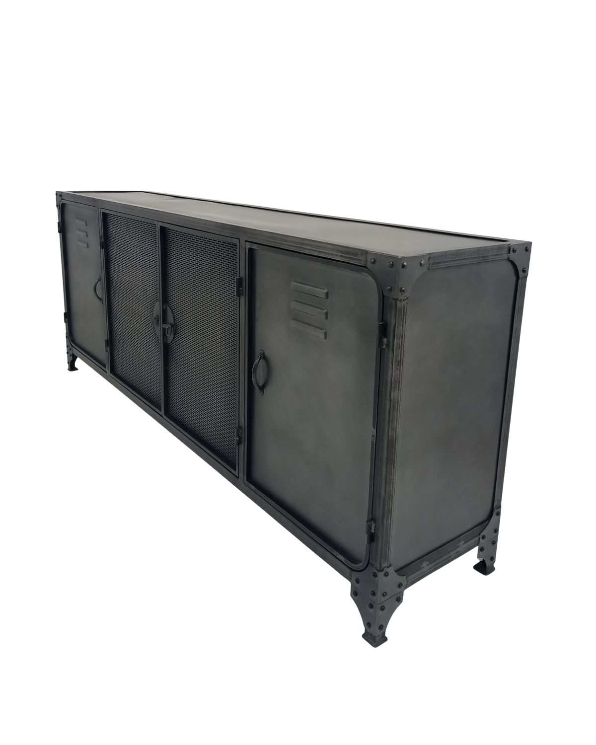 The design features four front doors – solid metal doors at each end with locker-style vents, and double mesh doors in the centre for a semi-open look and ventilation. Inside, generous shelving offers ample space for media equipment, serveware, books, or bar essentials, while the broad top surface is perfect for a TV, décor, or serving area. Riveted corner details and industrial ring pulls complete the rugged, urban aesthetic.