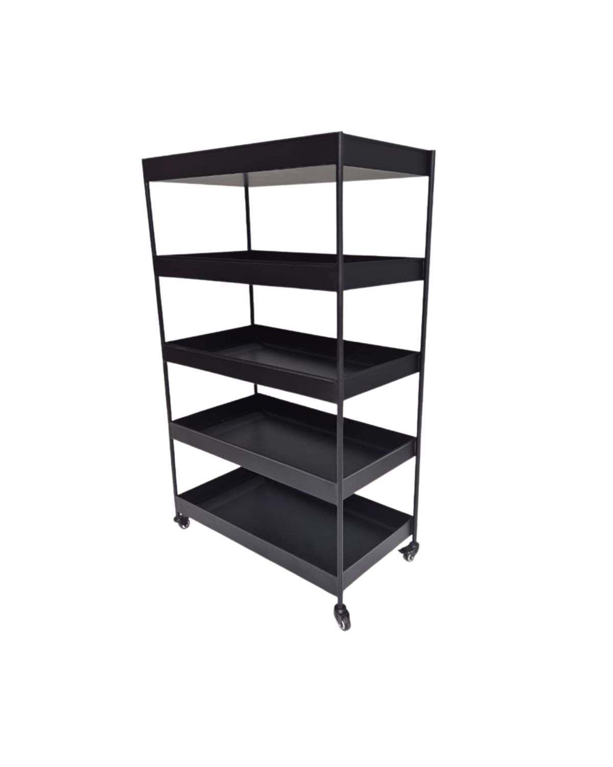A durable industrial metal storage rack with five shelves and rolling wheels—perfect for modern homes and workspaces. Practical, stylish, and built to last by VB Crafts.