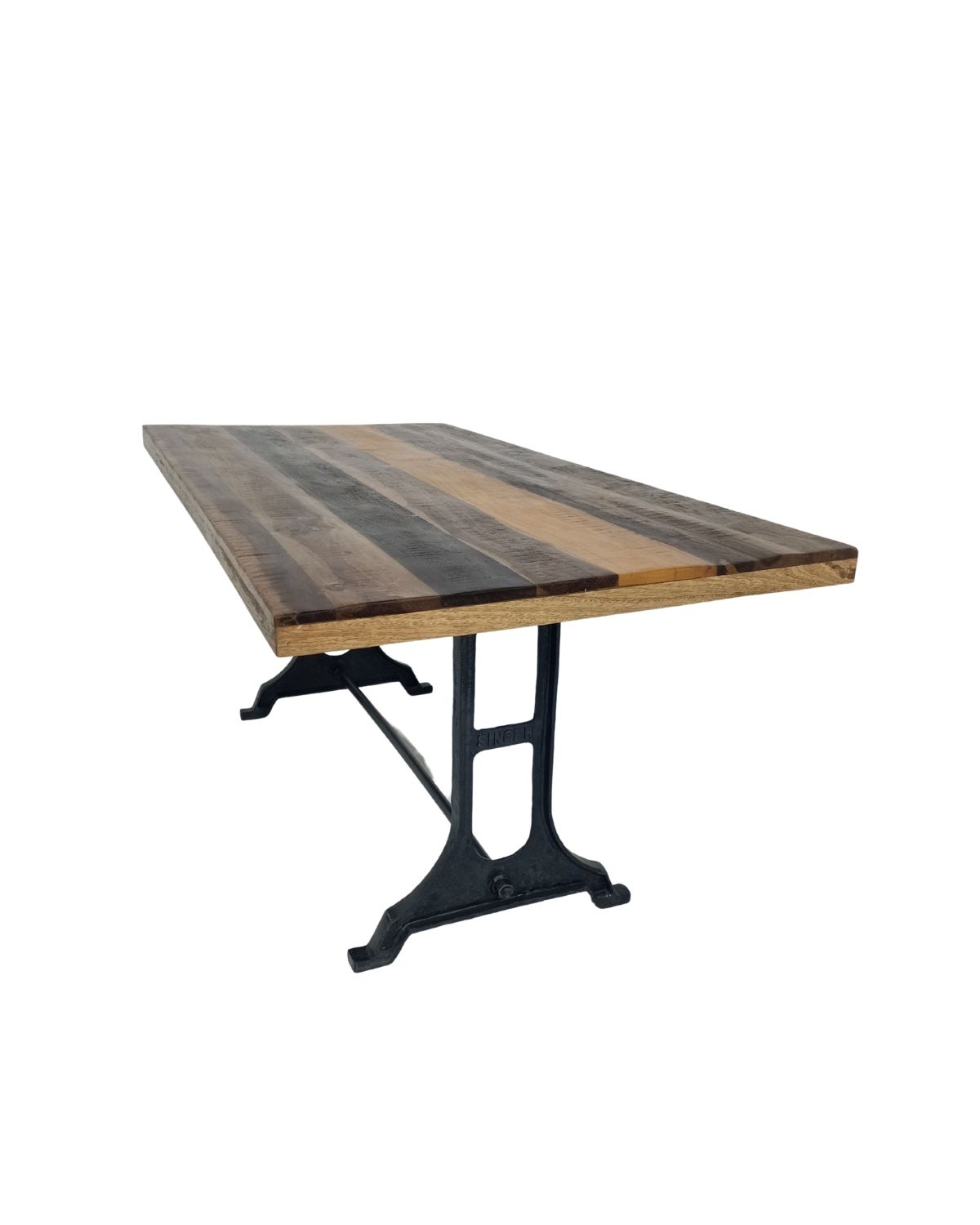 A bold industrial dining table with a multi-tone wood top and iconic Singer base—perfect for adding character and strength to any space.