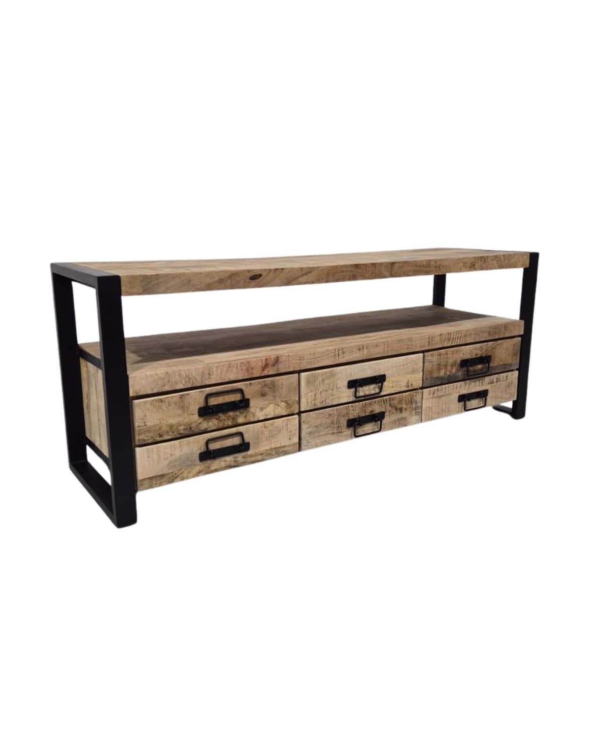 A rugged industrial solid wood TV cabinet with a bold metal frame and spacious drawer storage — functional, stylish, and built to last by VB Crafts.