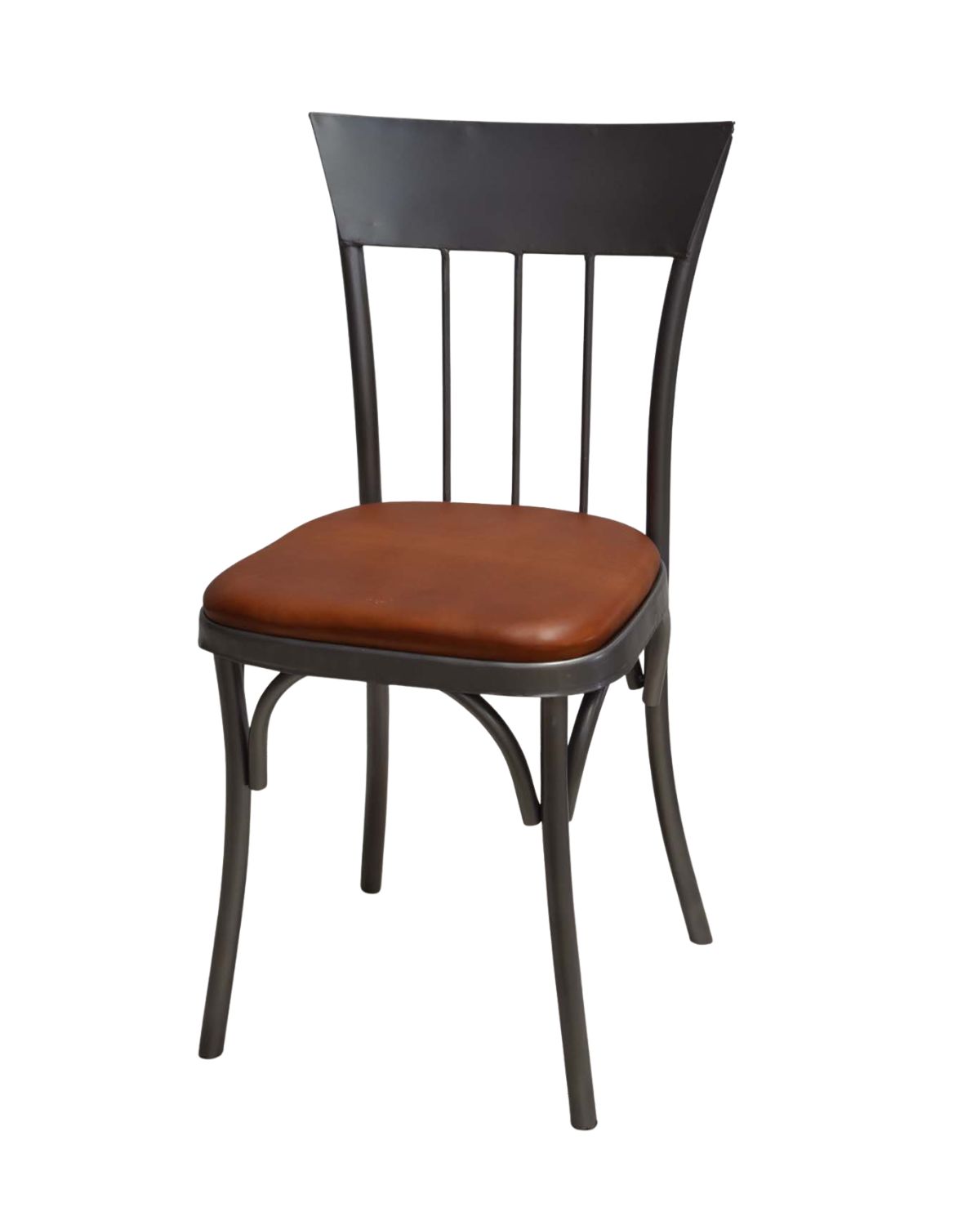 Stylish metal bistro chair with cushioned brown seat and sleek flared back—perfect for adding café-style comfort to any dining or hospitality space.