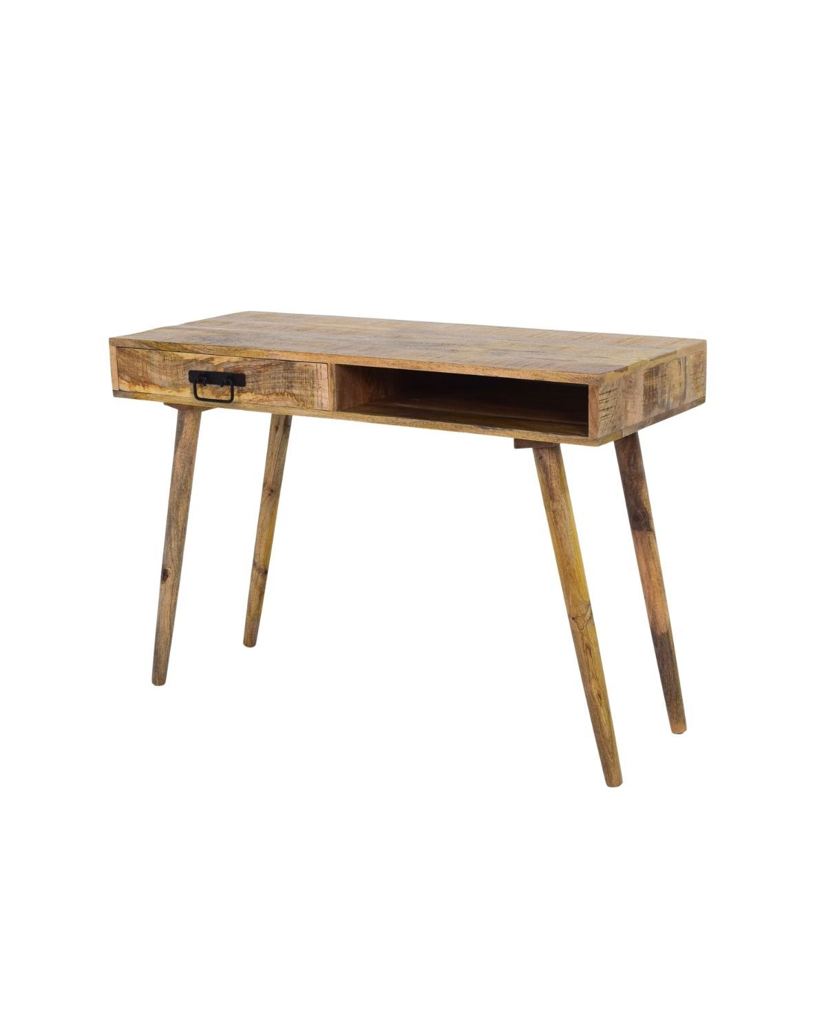 Elevate your workspace with this beautifully handcrafted Mango Wood Study Desk, designed for both style and practicality. Its sleek and minimal silhouette paired with natural wood grains makes it a perfect addition to modern, rustic, or Scandinavian-inspired interiors. The desk features a convenient open storage shelf for essentials and a side drawer with a vintage metal handle, offering a perfect blend of organization and charm. Ideal for study rooms, home offices, or creative workspaces.