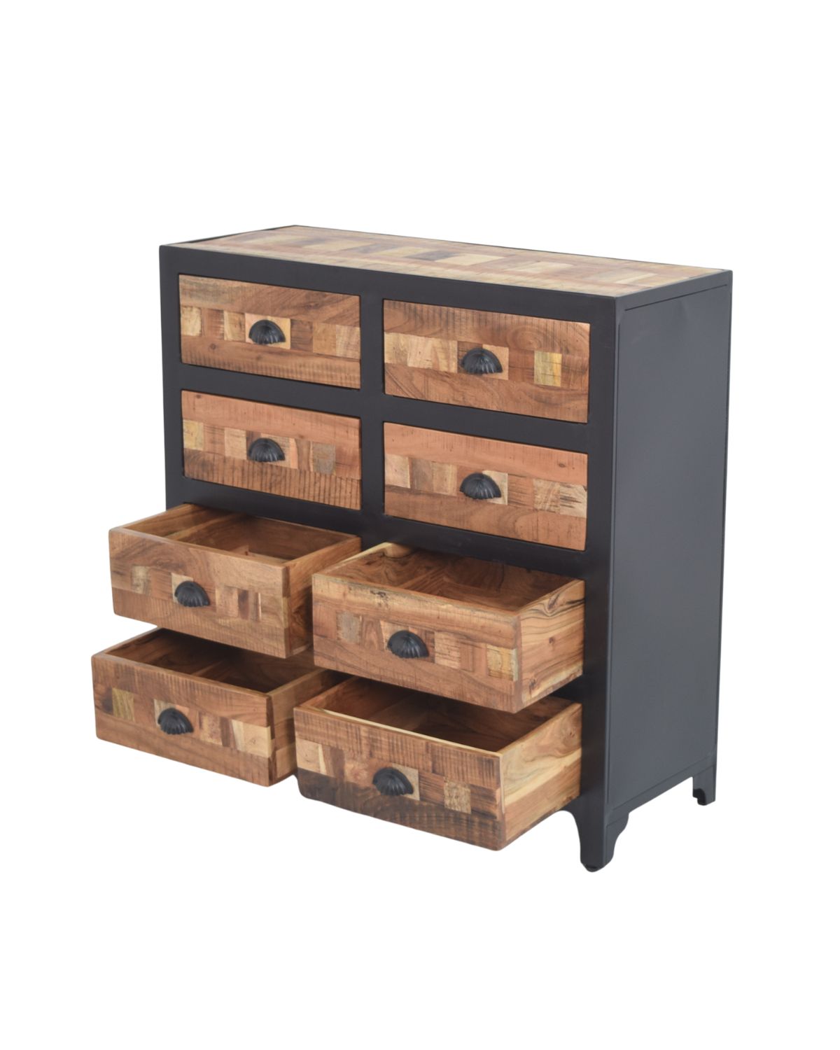 An industrial-style 8-drawer chest in black metal with patchwork mango wood fronts, offering stylish, compact storage for any room – exclusively from VB Crafts.