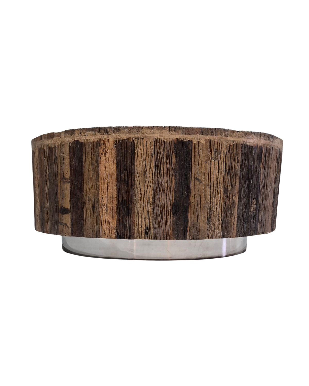 Reclaimed Wood Round Drum Coffee Table with Stainless Steel Base