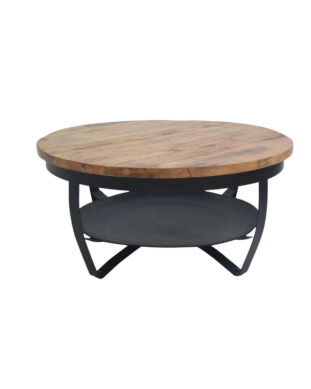 Round Industrial Coffee Table with Mango Wood Top & Metal Storage Shelf