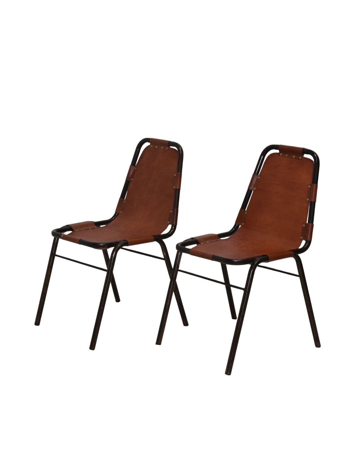 Set of 2 industrial metal-frame chairs with brown leather-style strap seat and back—lightweight, stylish, and perfect for dining rooms, cafés, and modern loft interiors.