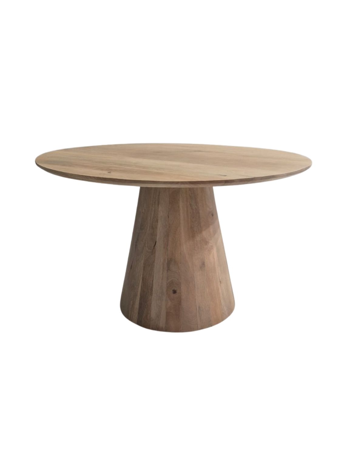A beautifully handcrafted round wooden table with a striking cone pedestal base—perfect for modern and elegant dining spaces.