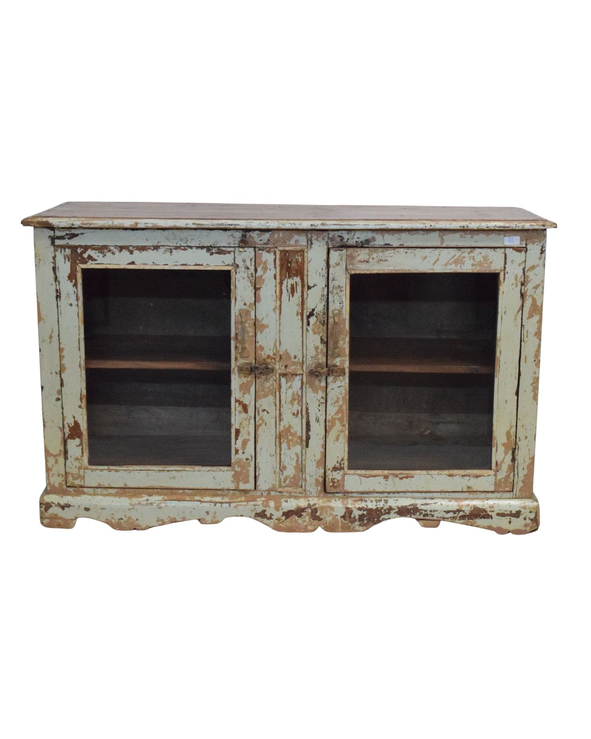 This Vintage Distressed Glass-Front Cabinet brings timeless charm and rustic elegance into any space. Crafted from reclaimed wood and finished with a beautifully weathered patina, this antique piece showcases two glass-paneled doors that open to spacious shelves. Its naturally aged texture and chipped paint reveal years of character, making it a stunning decorative and functional addition to your home. Perfect for displaying décor, storing tableware, or enhancing any living area with authentic vintage appeal.