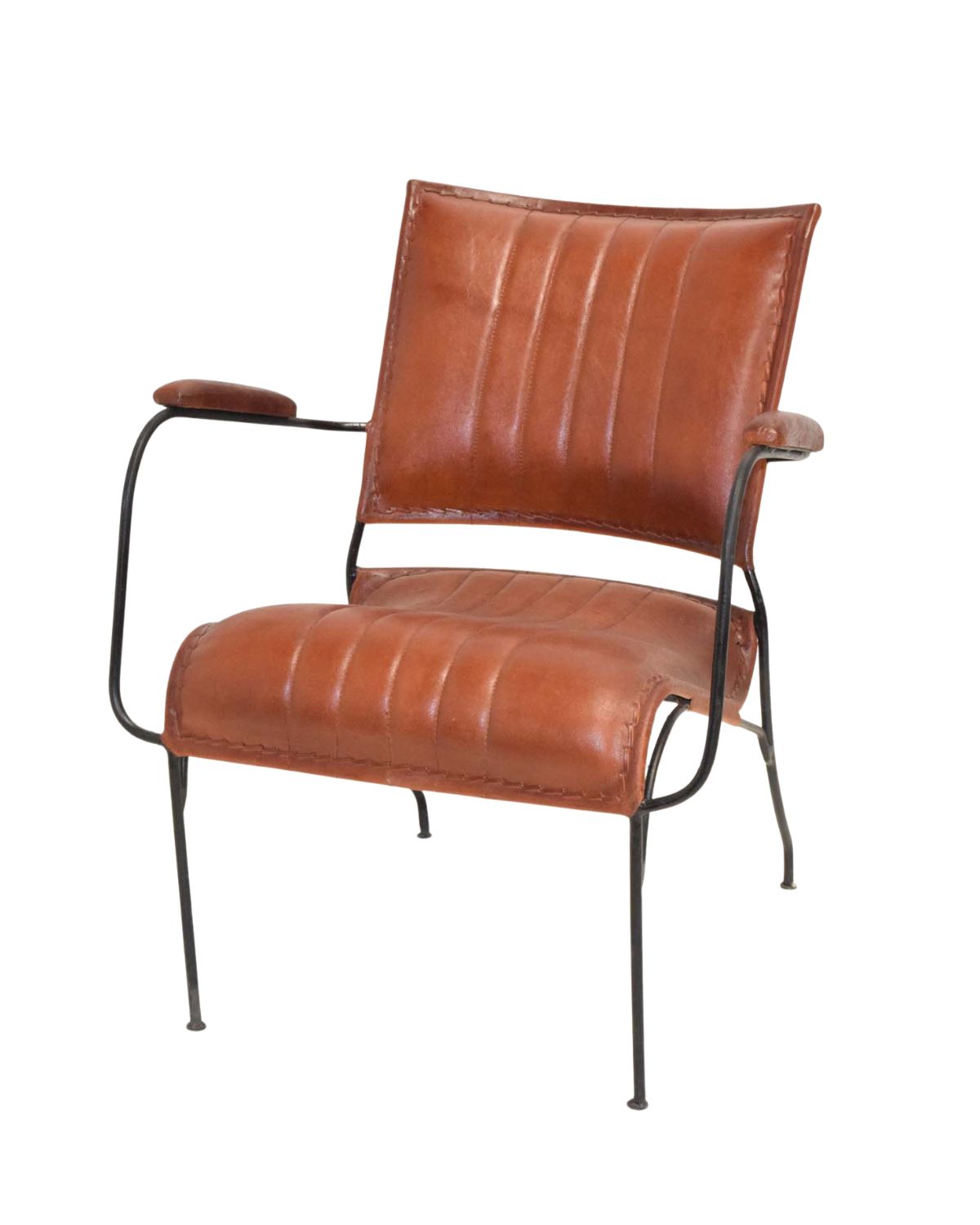 Vintage-style leather lounge chair with a slim black iron frame, padded seat, back and armrests—perfect for adding warm, relaxed elegance to any living room, office or café space.