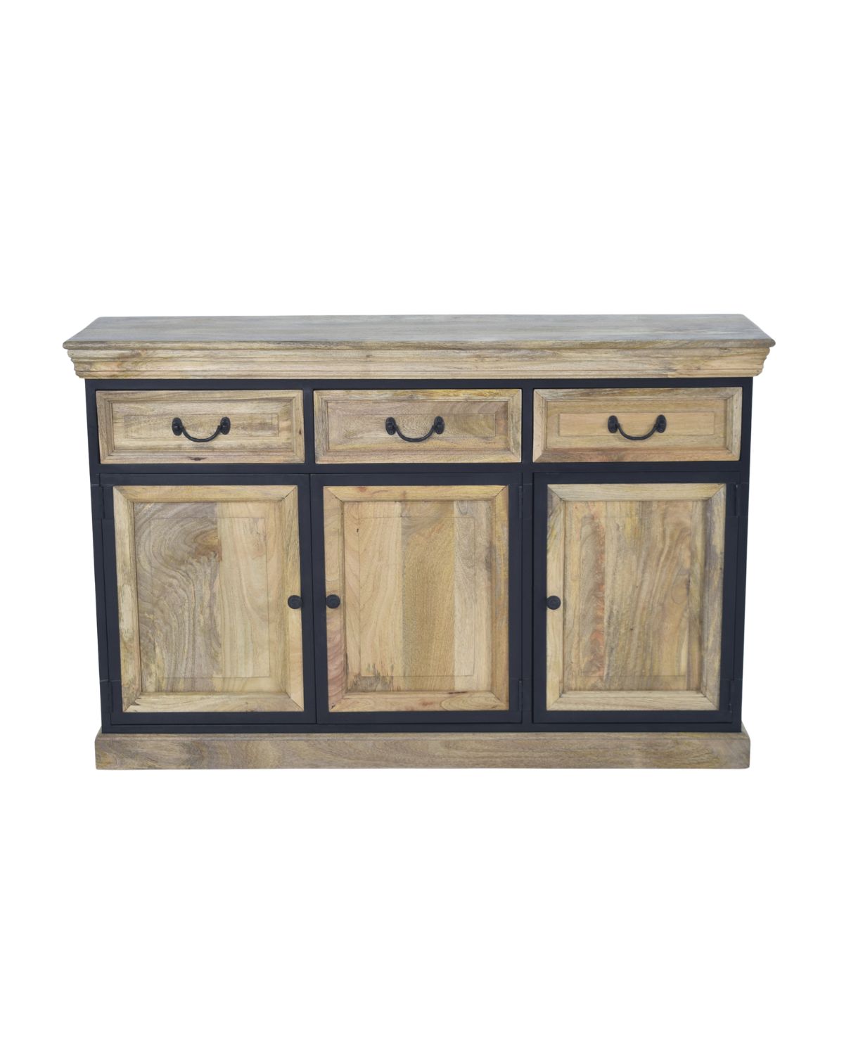 The Vintage Mango Wood & Iron Frame Sideboard is a beautifully crafted storage unit that blends rustic warmth with industrial charm. Featuring solid mango wood panels enhanced with a contrasting black iron frame, this sideboard brings character and durability to any space. The three upper drawers provide organized storage for small essentials, while the spacious lower cabinets offer ample room for dinnerware, linens, or household items. Its classic design with vintage-style hardware makes it an elegant addition to dining areas, living rooms, or hallways.