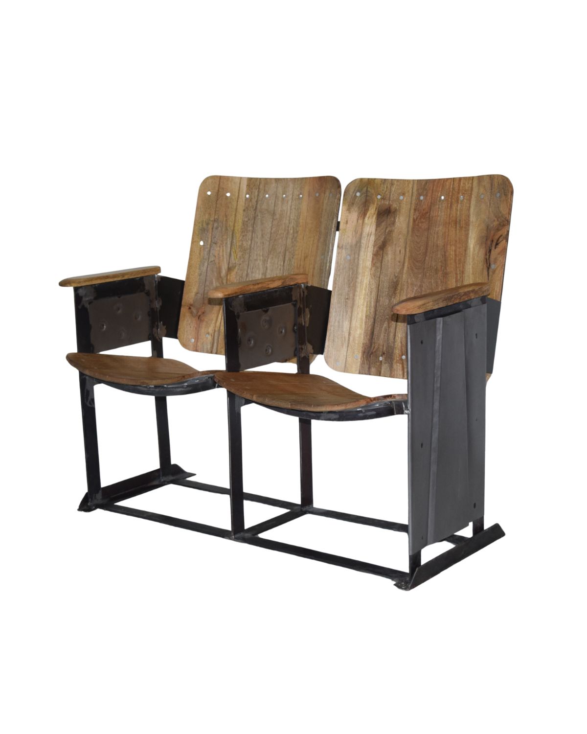 A nostalgic double seater theatre chair in solid wood and metal, perfect as a statement bench for home theatres, cafés, entryways and vintage-inspired interiors.